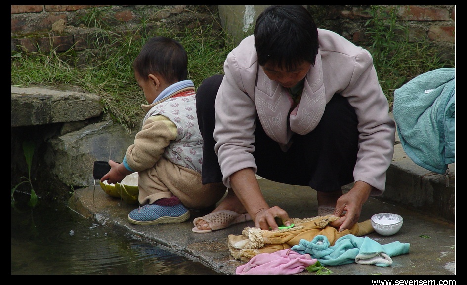 路边沟渠边的大婶正在浆洗衣服