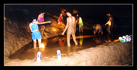 从小潭处划进去,我们低着头,因为上面都是钟乳石,不小心很容易碰到头。小船一划进去,就感到一股凉气逼来,四周静静的,只听到划水的声音,不一会儿,就上了岸,这时洞里全是钟乳石了,奇形怪状光怪陆离。来到了一片黄黄的面积不大的泥坑,这里就是西街上到处都有照片介绍也是我们最向往的泥巴浴了。
