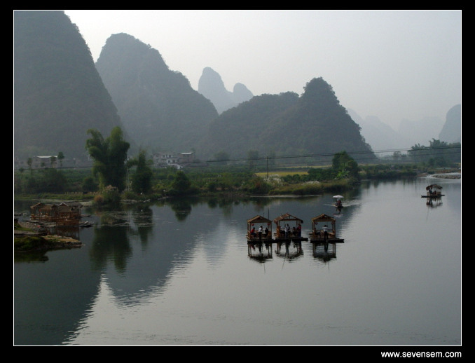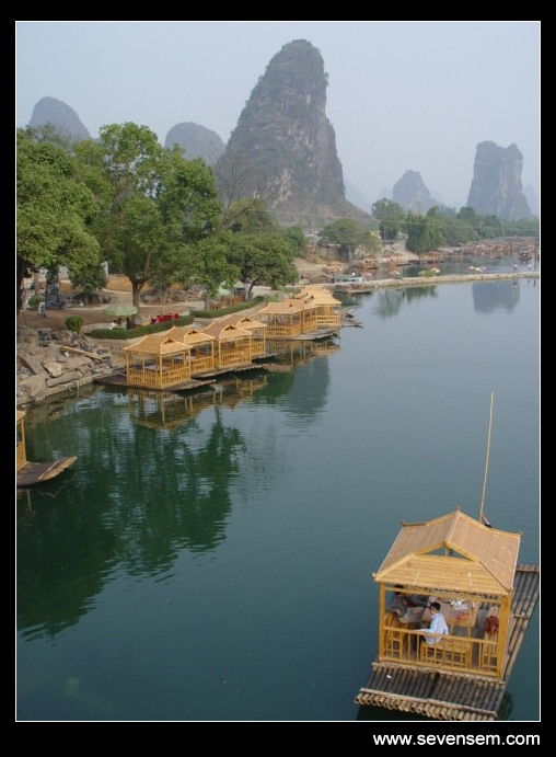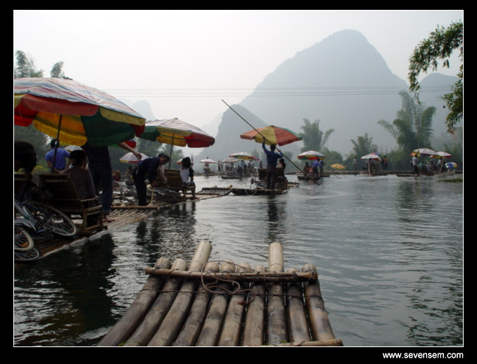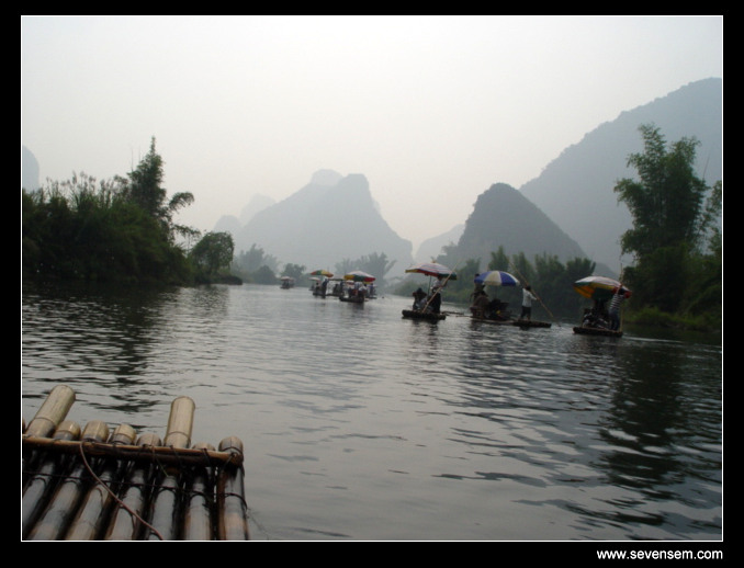 越往下漂,人越多,还可以打下水仗。水面上到处是竹筏,远远忘去,能看到著名的月亮山。转眼间到了此次漂流的终点-工农桥,漂在遇龙河畔的之间,让人有一种回归自然的愉悦和舒适感。