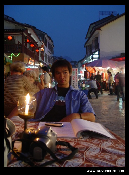 7点多了,西街已经灯火通明,来自世界各地的游客把西街装点成了另外一个世界,以前总觉得稀罕的东西在这里一览无余,古典的民居,民族的服饰,西方的酒吧,阳朔的本地小吃,应有尽有。