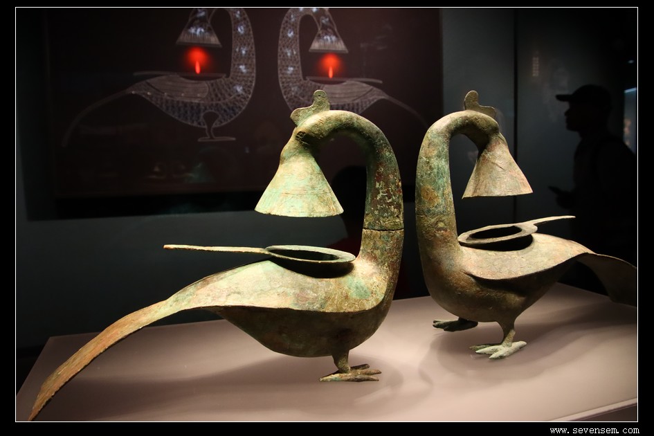 旁边的西汉羽纹铜凤灯更绝,两只凤鸟亭亭玉立,嘴里衔着灯罩,最妙的是它的“环保设计”——燃烧的油烟会顺着灯罩流进凤鸟肚子里的清水里,一点不污染空气,古人的智慧真的不服不行!