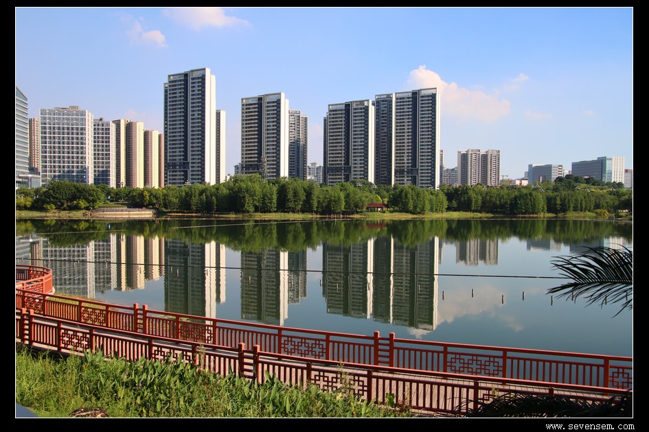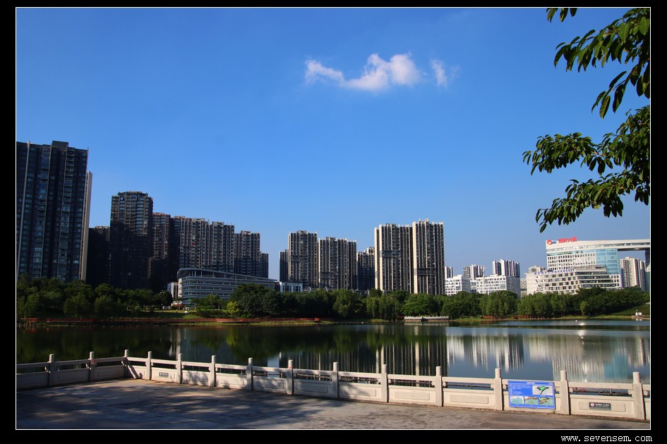 宽阔澄澈的湖面便映入眼帘,周围的高楼大厦连绵起伏,和蓝天白云一同倒映在湖中,宛如一幅绝美的现代画卷。