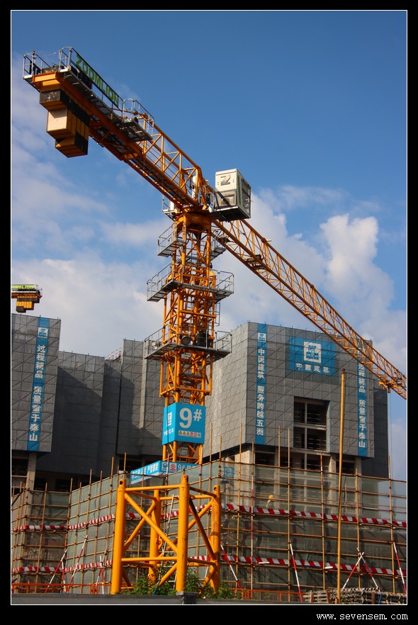粗壮的钢绳吊起成捆的建材,从地面缓缓升向高空,在蓝天白云的映衬下划出一道道利落的弧线。